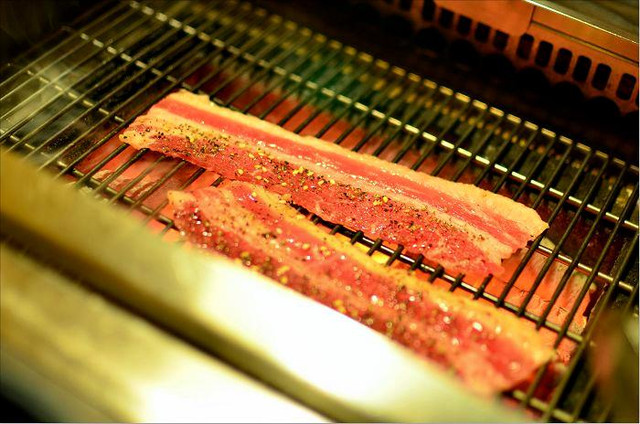 當他放下去幾秒之後,表層開始出水、內縮,翻面後,再烤個幾秒就可以直接享用了。