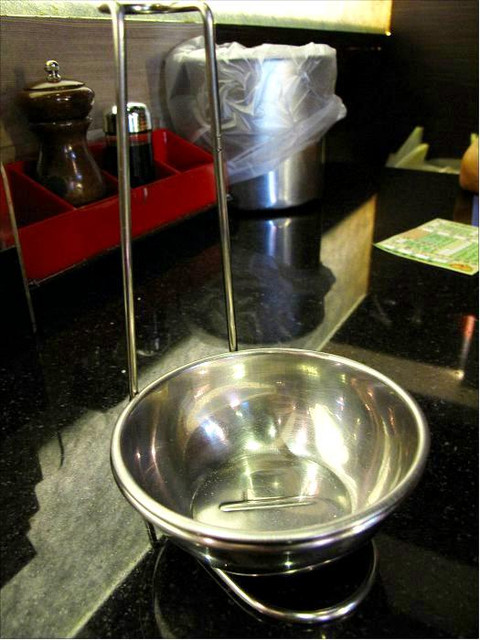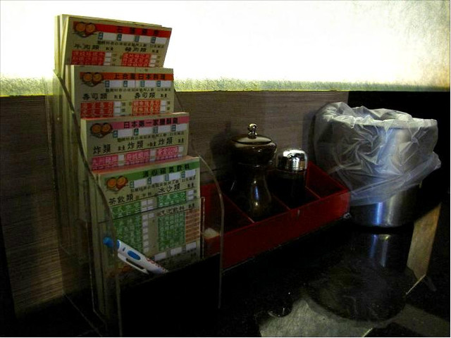 桌上擺置著點菜單、醬油、垃圾桶。