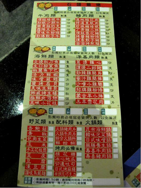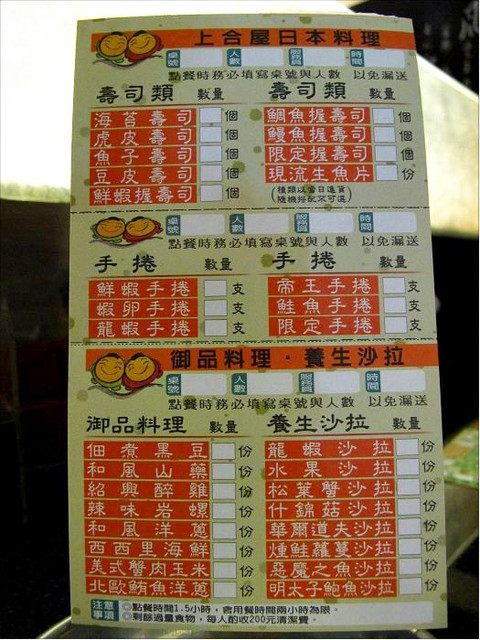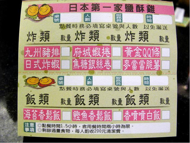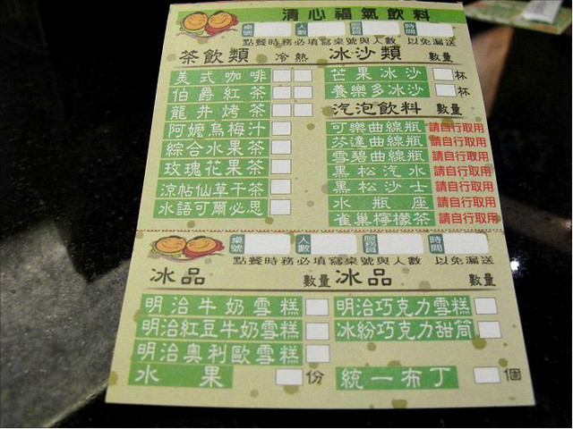 點餐方式,就是在點菜單上畫上自己想要的菜色,而後交給服務人員,
