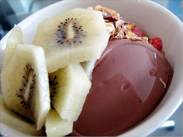 這天,剛好去買了巧克力布丁,然後將奇異果舖在巧克力布丁上面,
